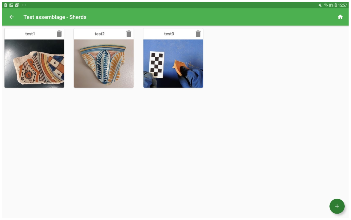 The collection of sherds composing an assemblage are presented as a grid showing the featured image of the sherd (the first added) and providing buttons to access the sherd details or remove the sherd (garbage basket). A new sherd may be added directly using the “+” button on the right bottom corner of the window.