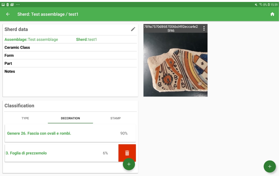 The name and general information may be modified using the edit button (pen) near the sherd name. The classification info contains the list of classes (types, decoration and stamps) to which the sherd may belong to. The classification may be defined manually using the “+” button present in each tab or automatically using the classification tools. Using the swipe gesture on an element of the list is possible to remove the classification.