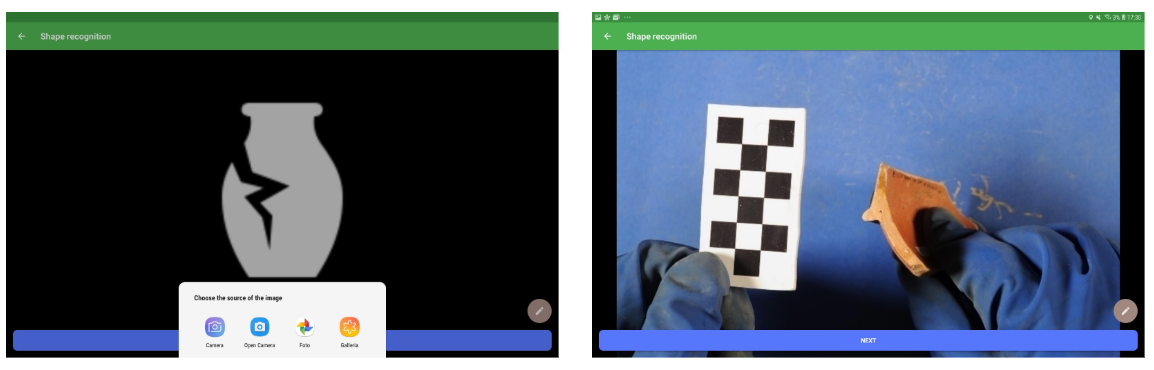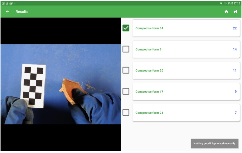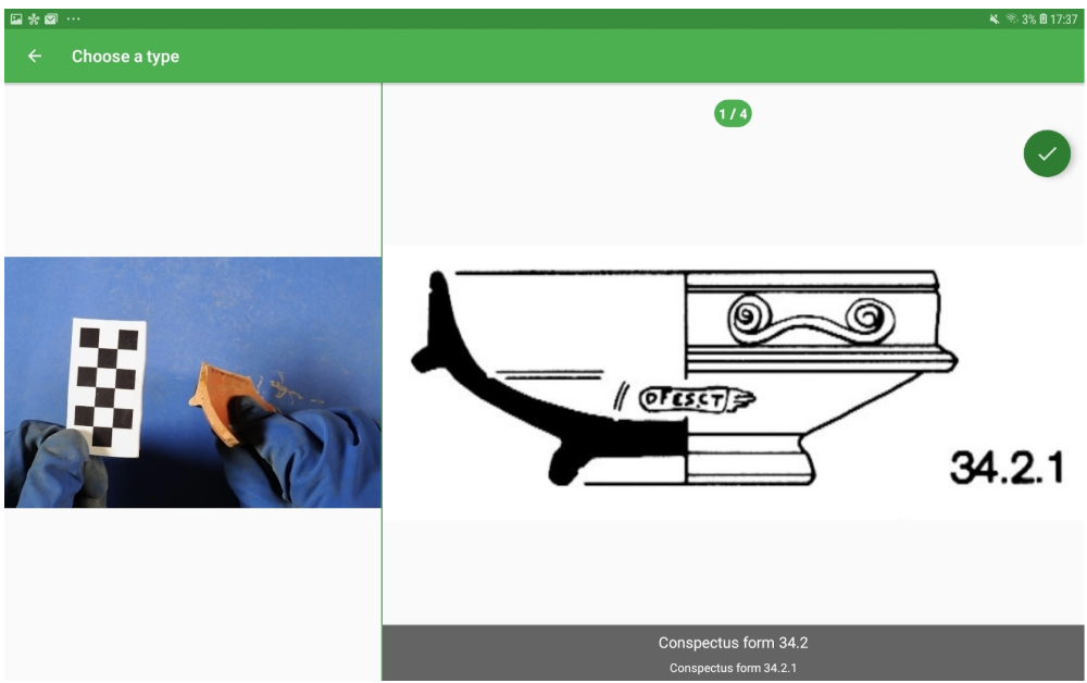 As already explained for the decoration recognition, if the user isn’t happy with the prediction may proceed manually tapping on the button “Nothing good? Tap to add manually” and enter the visual matching interface. In the case of shape recognition, the comparison is between the sherd image and the drawing associated with the ceramic types in the Reference Database (see picture above).