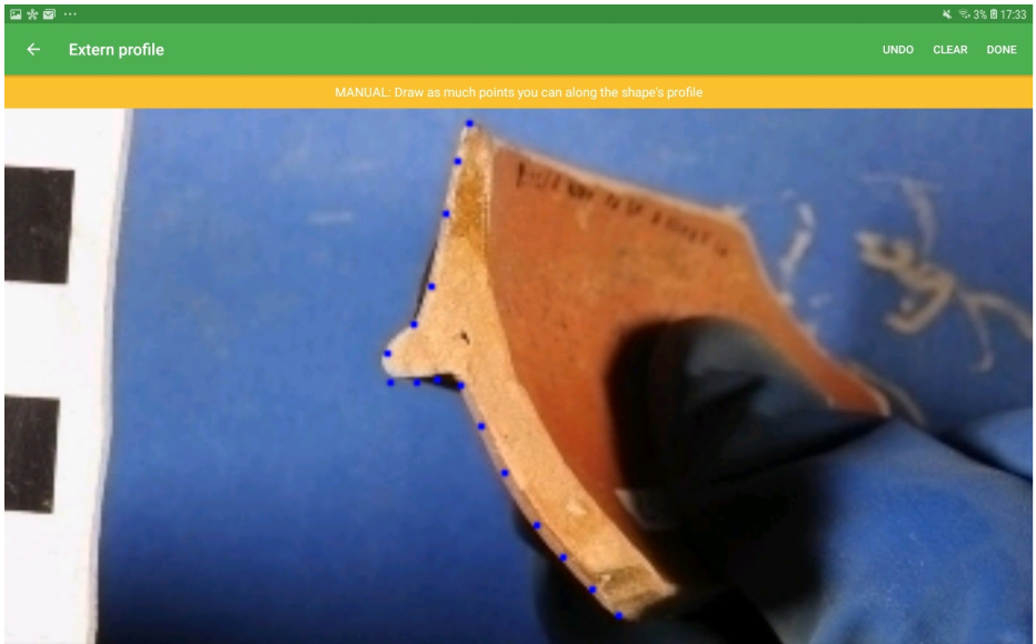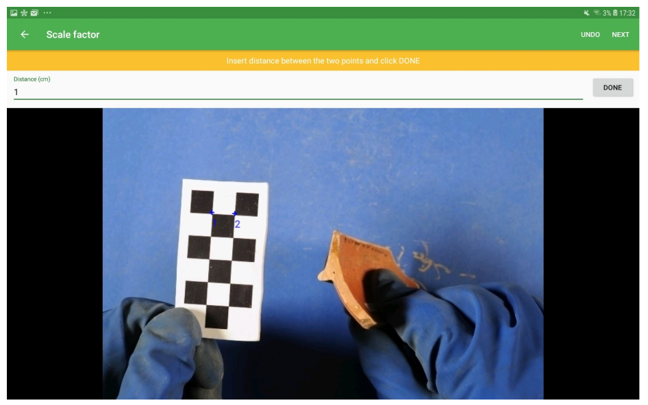 The definition of the scale factor is important in order to scale the image to the dimension of real vessels, helping the recognition tool in its search and retrieval task. To define the scale factor the user will be asked to select 2 points in the image and assert the distance in real life. For this reason, users must take pictures of the potsherds always with a ruler, that will have to be placed at the same level as the fractured profile.