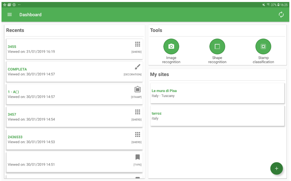 This area contains the list of the entities (sherds, database records, etc.) visualised or edited by the user, ordered from the most recent to the oldest. Tapping on the entity will open the entity visualiser. The idea is that the user returning to the dashboard may access directly the entities he/she was working on the last time he/she accessed the app or a few minutes before.
